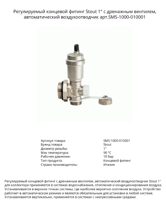 Регулируемый концевой фитинг с дренажным вентилем, автоматический воздухоотводчик Stout 1" для коллектора применяется в системах водоснабжения, отопления и кондиционирования воздуха. Устанавливается в верхних точках системы, где наиболее вероятно скопление воздуха. Устройство работает в автоматическом режиме и является обязательным для установки в любой системе. Устанавливается вертикально, применяется в системах с неагрессивными средами.